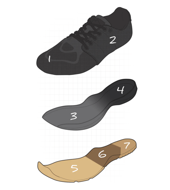 Underneath you have a dual midsole and outsole construction. The midsole has a Gradient Density EVA foam material. This offers a thinner, more flexible forefoot while having a thicker portion under the heel for stability. The outsole is composed of triple-compound rubber. This allows for great traction, 3x support under the midfoot for lifts, and a dense under-heel feel.